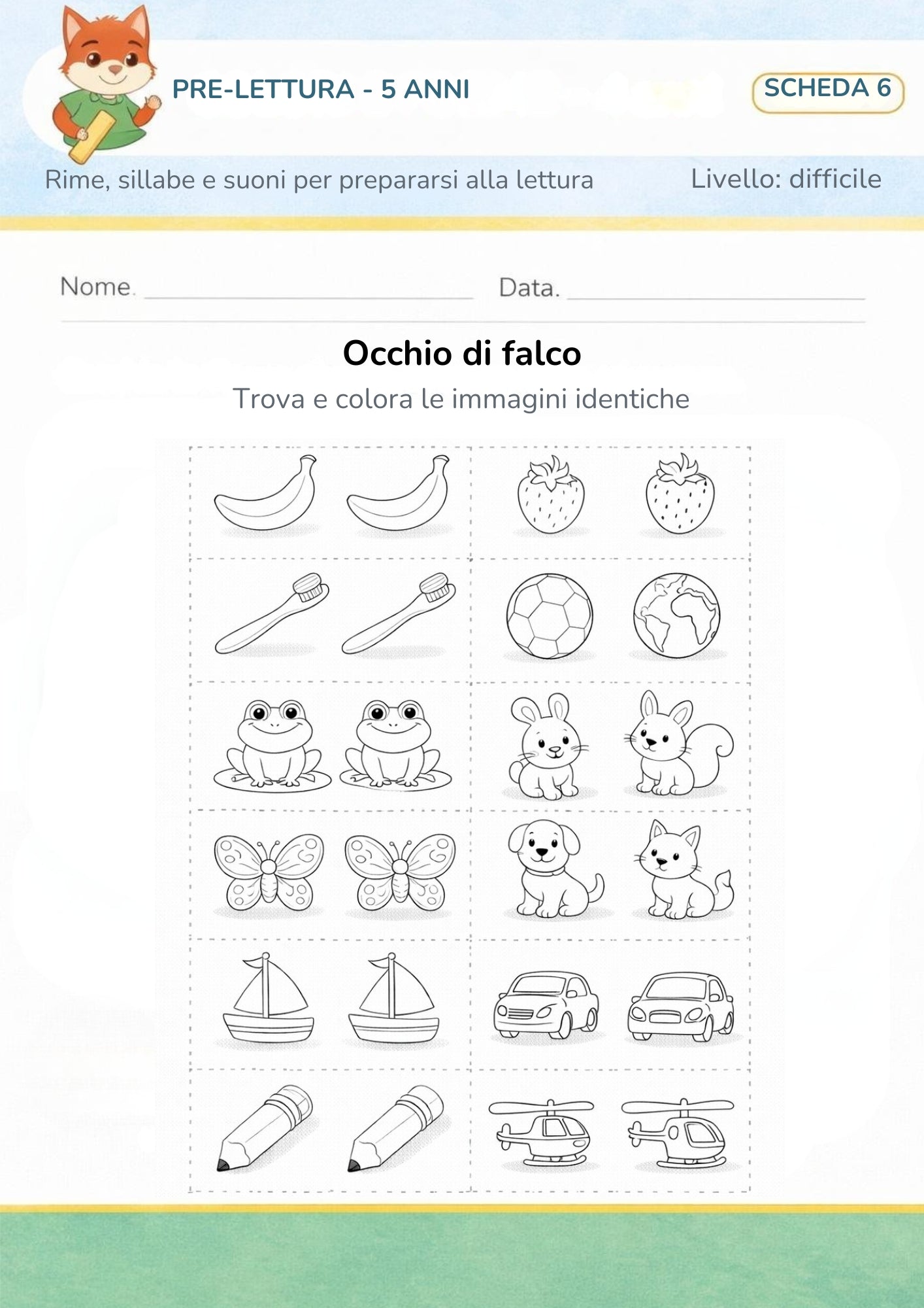 Schede stampate + matita o pennarello. 5–10 minuti per scheda, in base al livello del bambino.